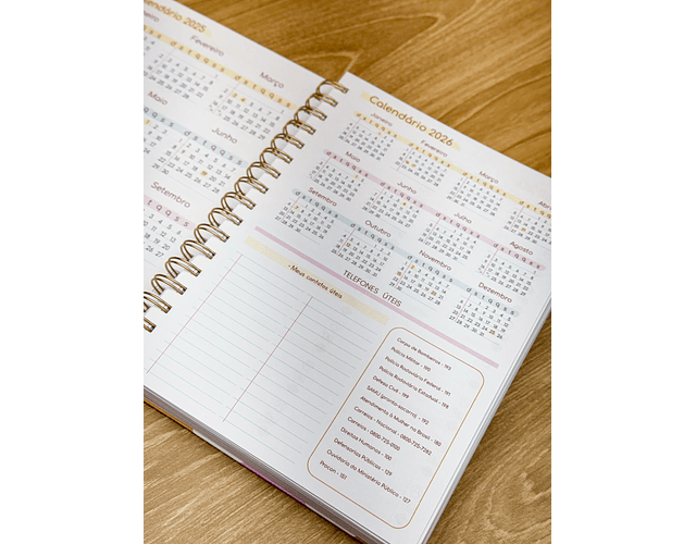 Pág de dados, calendário 25-26, lista telefonica, logins e senhas, controle de saúde, planejamento anual, metas do ano e planejamento mensal e semanal com marcação do dia da semana e controle financeiro DE JANEIRO A DEZEMBRO.